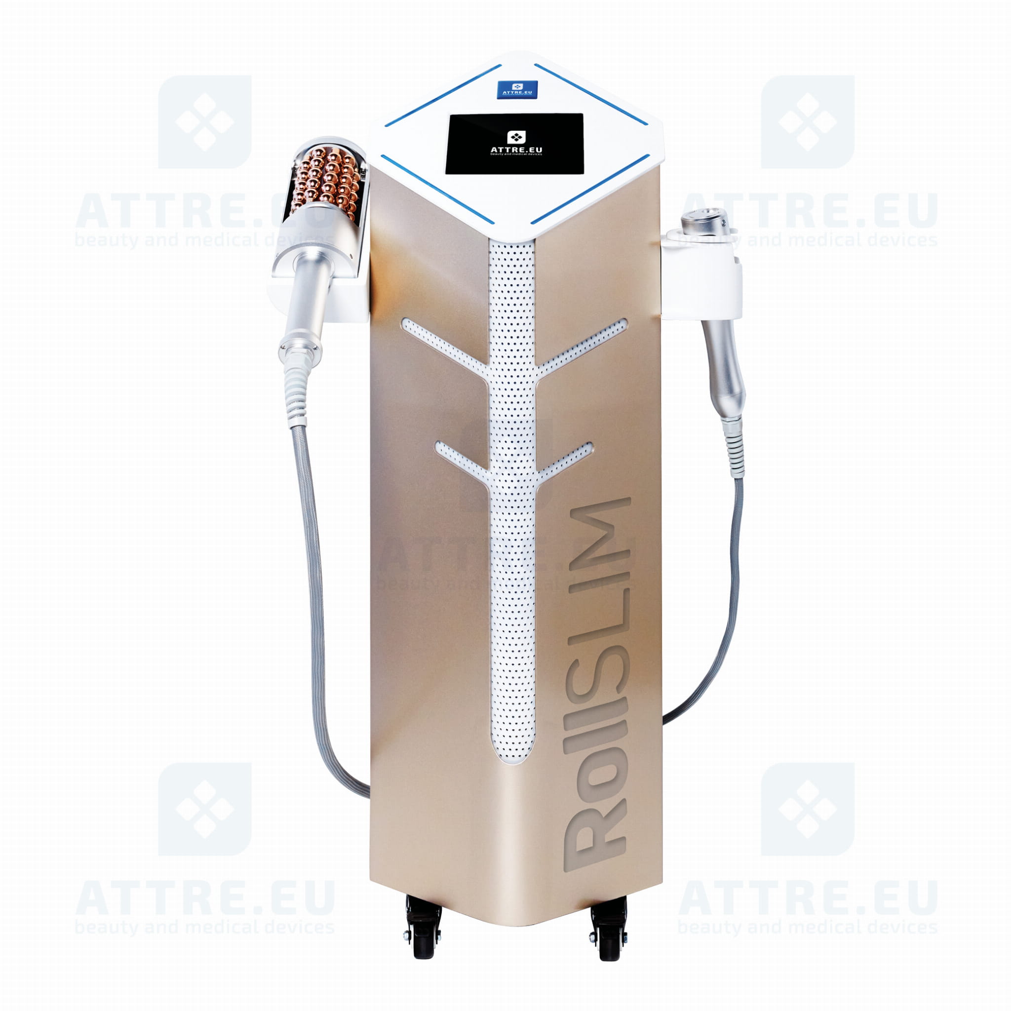 Rollslim wyposażony jest w dwie wielkości rolek. Duża przeznaczona jest do zabiegów na ciele, mniejsza do zabiegów na twarzy oraz mniejszych partiach ciała. Urządzenie pozwala dopasować intensywność masażu do wrażliwości pacjenta i oczekiwanych efektów. Częstotliwość wibracji jest regulowana w zakresie od 40 do 254 Hz.